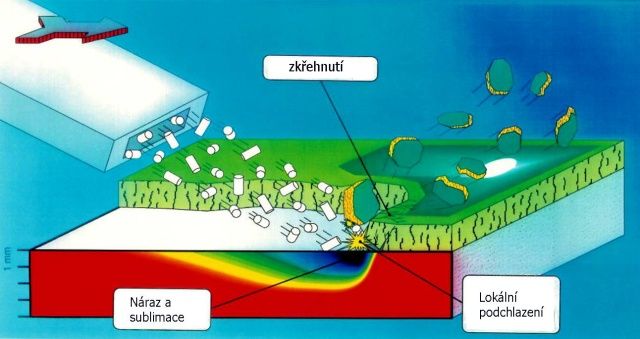Tryskání suchým ledem je jedna z nejprogresivnějších technologií poslední doby. Ekologická, rychlá a efektivní metoda odstraňování různých tipů nečistot. Oproti vodnímu ledu přechází suchý led přímo z pevného stavu do plynného. Provádíme pouze neabrazivní otryskání suchým ledem-odstraňuje nečistoty na původní podklad(kov nebo na původní nátěrový systém)