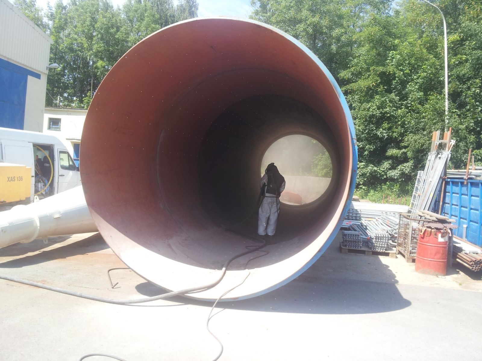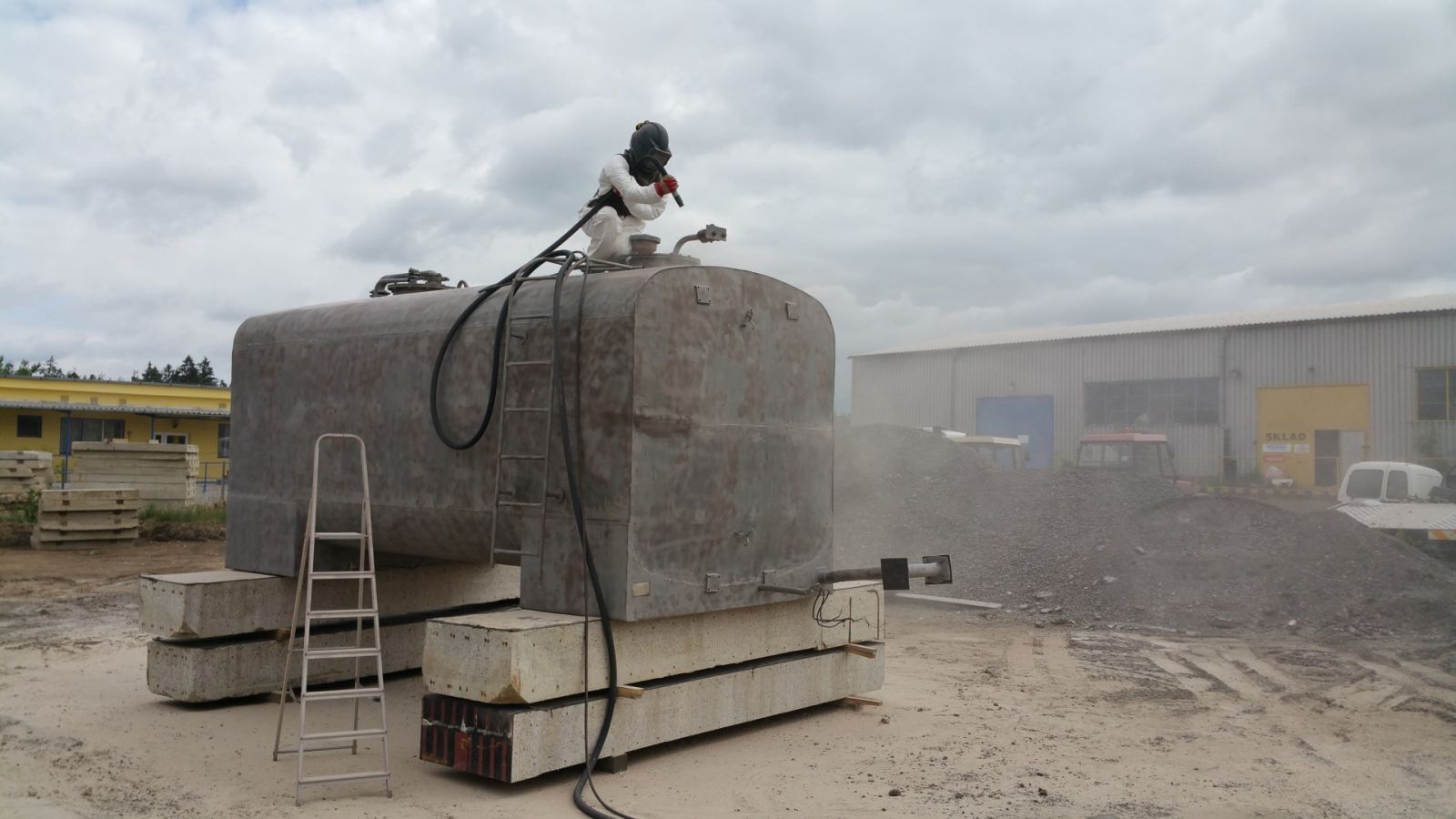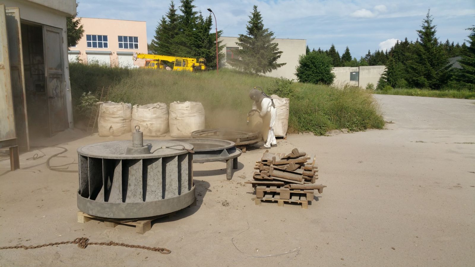 Tryskáme ocelové mosty, ocelové profily a konstrukce, betonové nádrže, betonové mosty, zásobníky krmných směsí, zemědělské stroje a zařízení, vleky, návěsy a součásti automobilů, potrubí, kovářské výrobky, nátěry na výrobcích, cihly, beton, kamen, schody, památky, sklo atd.